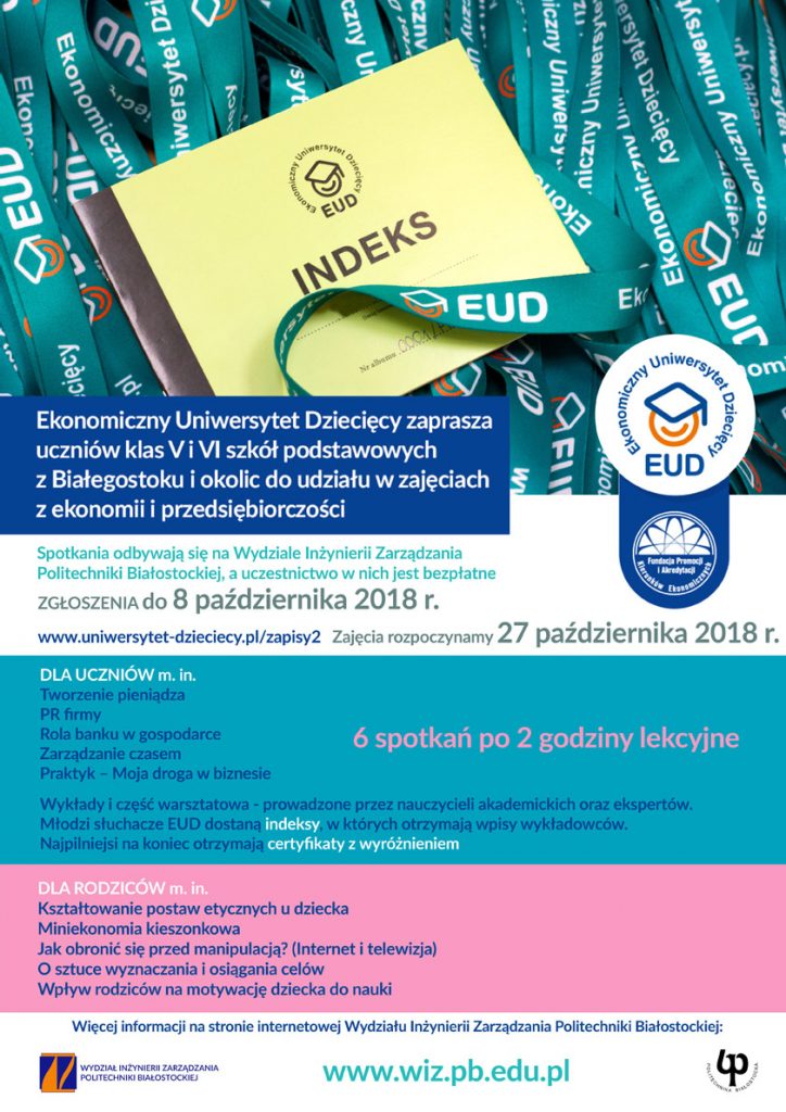 Do 8 października 2018 r. potrwa rekrutacja na zajęcia prowadzone w trzeciej edycji Ekonomicznego Uniwersytetu Dziecięcego w Białymstoku. Tak jak w przypadku poprzednich edycji zimowej do uczestnictwa w zajęciach zaproszeni są uczniowie 5. i 6. klas szkół podstawowych z Białegostoku i okolic. EUD to bezpłatne spotkania o tematyce ekonomicznej dostosowane do potrzeb dwunastolatków i trzynastolatków. Odbywają się w siedzibie Wydziału Inżynierii Zarządzania Politechniki Białostockiej na ul. Ojca Tarasiuka 2 w Kleosinie i prowadzone są przez nauczycieli akademickich oraz praktyków biznesu.