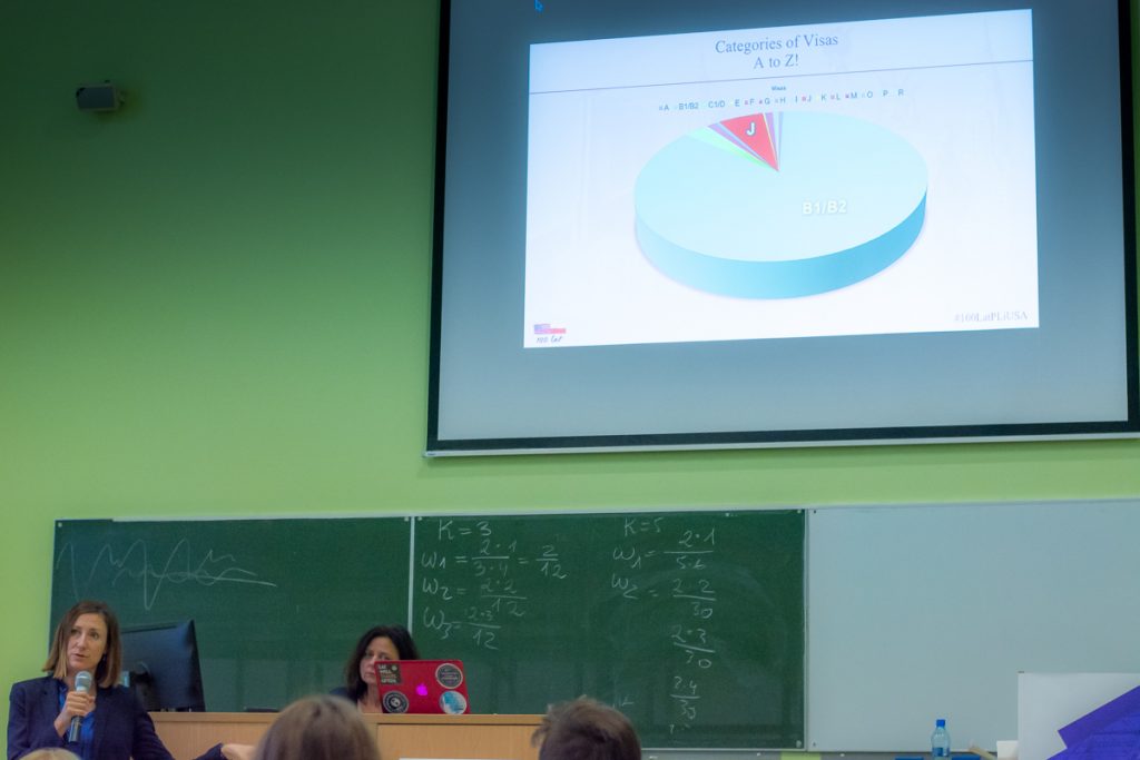 Pani Vice Konsul przedstawiła możliwości wyjazdu wakacyjnego w ramach programu Wymiany Kulturowej ze Stanami Zjednoczonymi. Przedstawiła informacje dotyczące formalnych kryteriów uczestnictwa w programie, miejsc do których można wyjechać, zasad uczestnictwa w programie. Udzielała odpowiedzi na pytania zgłaszane przez studentów i wyjaśniała pojawiające się wątpliwości.