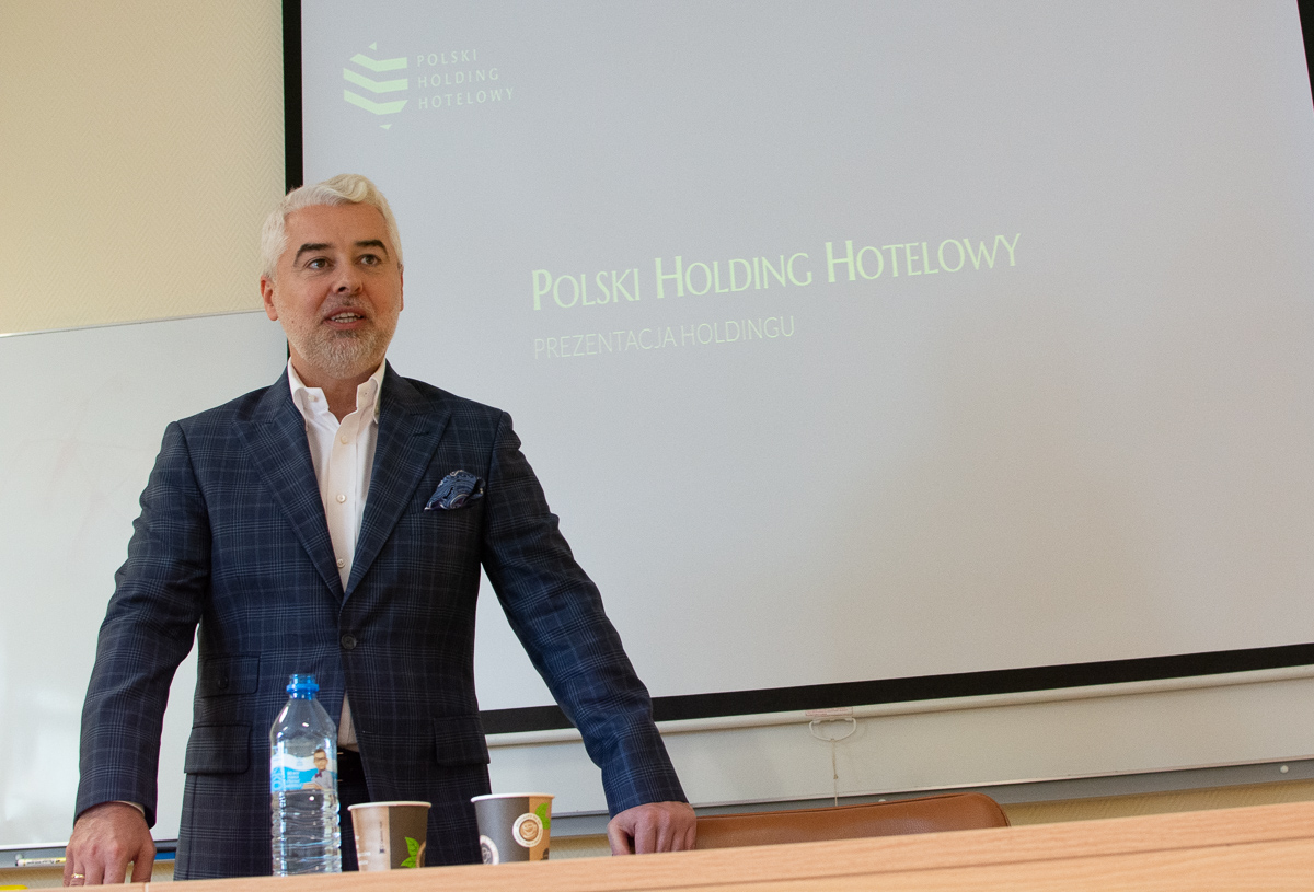 Tematem spotkania były cele i zadania holdingu liczącego już ponad 50 obiektów noclegowych, reprezentujących znane marki międzynarodowe takie jak: Hilton, Accor czy Marriott. Gość opowiedział też słuchaczom o swojej burzliwej karierze w branży hotelarskiej, w której wspinał się po szczeblach kariery poczynając od pracy recepcjonisty, aż po prezesa zarządu największej organizacji hotelarskiej w Polsce.