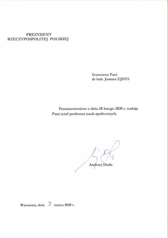 Prof. dr hab inż. Joanna Ejdys odebrała z rąk Prezydenta Rzeczypospolitej Polskiej Andrzeja Dudy akt nominacyjny potwierdzający nadanie jej tytułu profesora nauk społecznych (postanowienie z dnia 28 lutego 2020 roku). Uroczystość miała miejsce 16 września 2020 w Pałacu Prezydenckim.