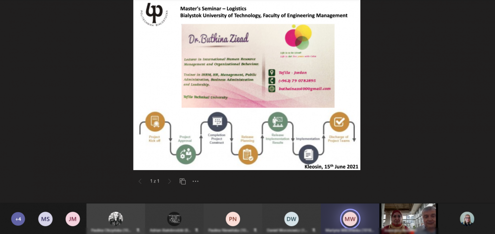W dniach 14 – 18 czerwca 2021 r. na Wydziale Inżynierii Zarządzania gościła dr Buthina Alobidyeen z Tafila Technical University z Jordanii. Władze Wydziału zorganizowały spotkanie, które dotyczyło możliwości dalszej współpracy. Pani Doktor prowadziła również zajęcia na seminarium u prof. n. ekon. i n. techn. dr hab. inż. Joanicjusz Nazarko. Studenci z ciekawością zgłębiali wiedzę na temat różnic kulturowych. Oprócz kwestii merytorycznych, zadbano o to, aby gość poznał uroki pięknego Podlasia.