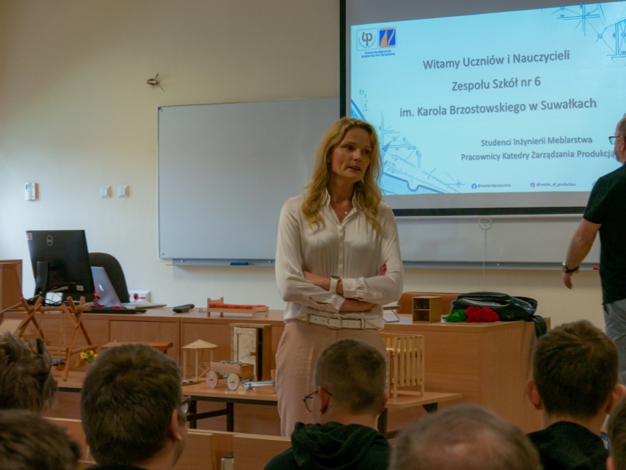 Uczniów przywitała Dziekan WIZ PB dr hab. inż. Katarzyna Halicka, prof. PB. Pani Dziekan zaprezentowała ofertę edukacyjną wydziału. Szczególną uwagę zwróciła na kierunki: zarządzanie i inżynieria produkcji oraz inżynieria meblarstwa, jako kierunki dedykowane uczniom klas drzewnych.