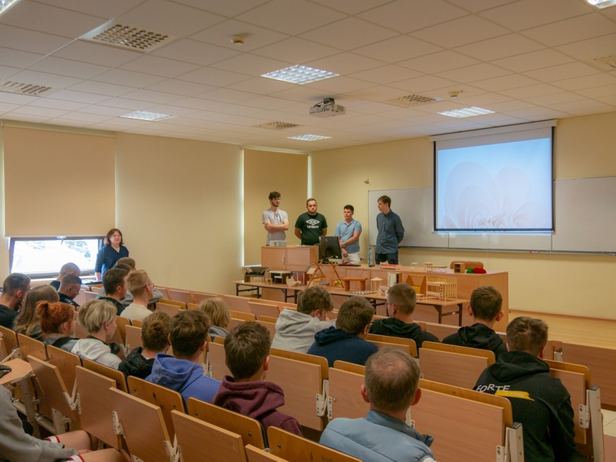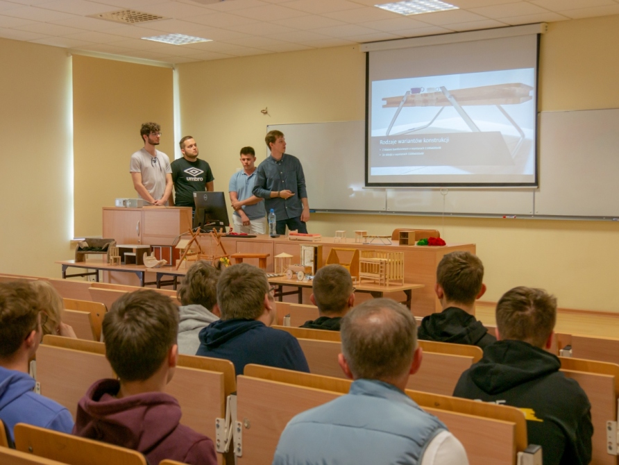 Uczniowie wzięli udział w zajęciach dydaktycznych prowadzonych przez dr inż. Elżbietę Krawczyk-Dembicką, gdzie mogli zobaczyć osiągnięcia projektowe studentów kierunku inżynieria meblarstwa. Studenci zaprezentowali również wybrane projekty realizowane w czasie studiów podczas I stopnia (studia inżynierskie).