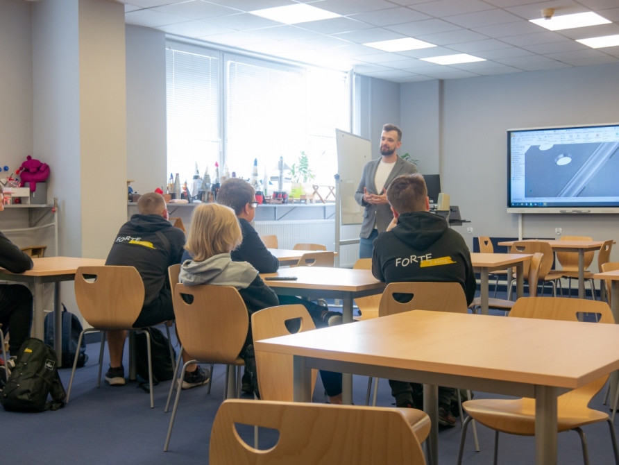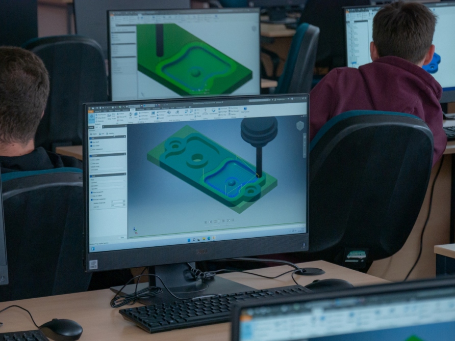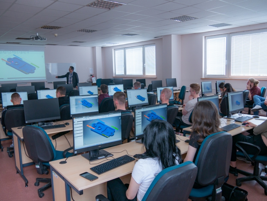 Następnie uczniowie odwiedzili pracownię komputerową oraz salę kreatywności wydziału, gdzie zajęcia poprowadzili dr inż. Łukasz Dragun oraz dr inż. Krzysztof Łukaszewicz. Zajęcia dotyczyły konstruowania i wykonania wyrobu oraz przygotowania i realizacji produkcji w czasach Przemysłu 4.0. Uczniowie przy pomocy prowadzącego próbowali przygotować program w środowisku HSM Inventor.