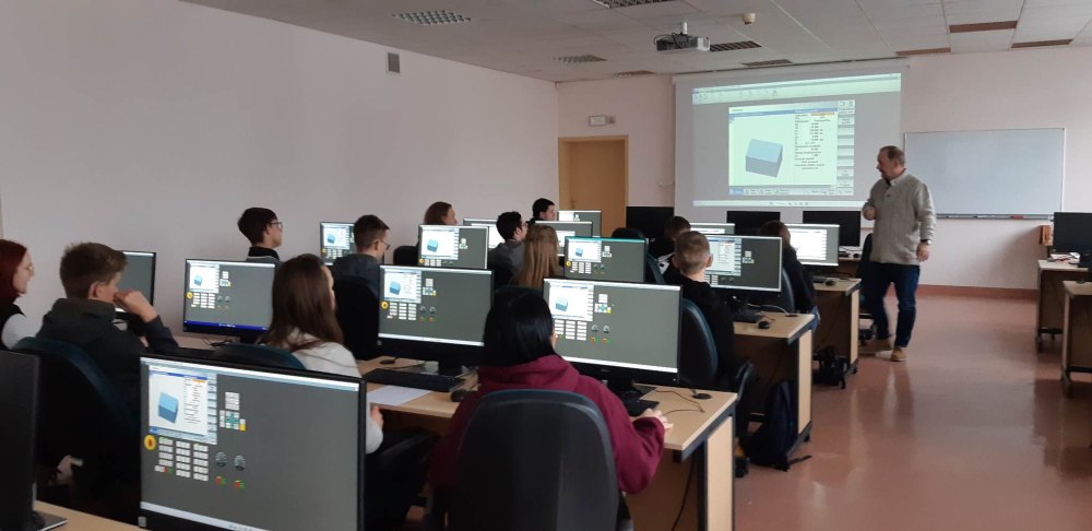 W Laboratorium Logistyki Wysokiego Składowania mgr inż. Mateusz Prorok uczył uczniów programowania robota – cubota. Na czym polega programowanie obrabiarek sterownych numerycznie Sinumerik Siemiensa opowiadał mgr inż. Krzysztof Połubiński.