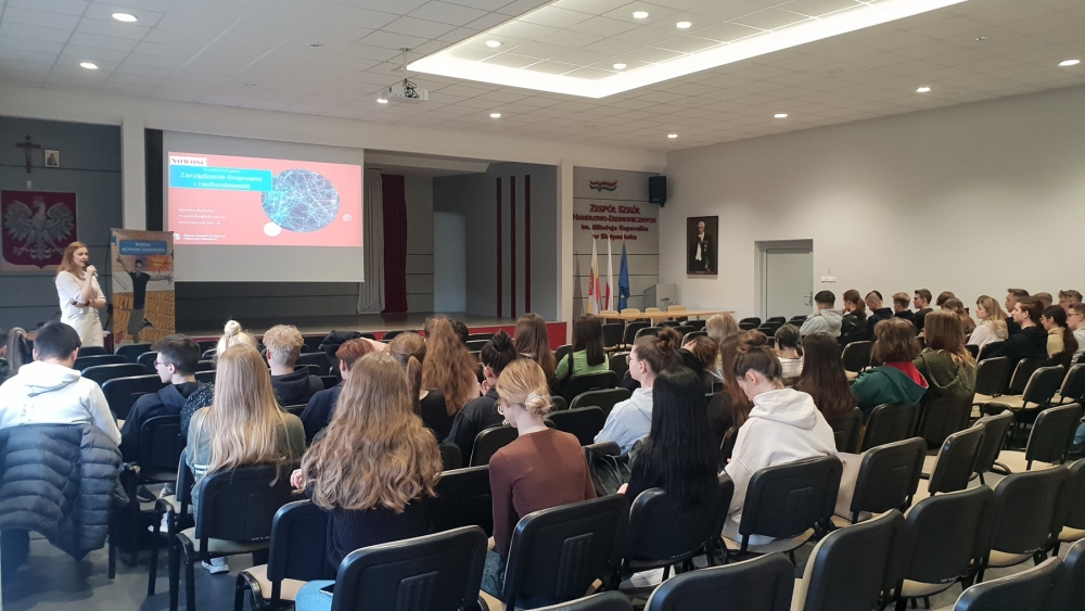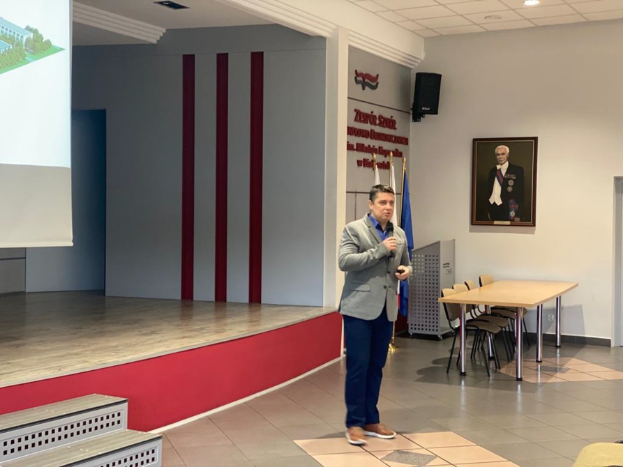 20 marca 2023 r. pracownicy naszego Wydziału spotkali się z uczniami klas maturalnych w Zespole Szkół Handlowo-Ekonomicznych w Białymstoku. Mgr Tomasz Trochimczuk przedstawił ofertę edukacyjną oraz opowiedział jakie korzyści przynosi ukończenie studiów na Wydziale Inżynierii Zarządzania Politechniki Białostockiej. Dr Monika Walicka, adiunkt w Katedrze Zarządzania, Ekonomii i Finansów, zaprezentowała nowy kierunek studiów, na który rekrutacja zostanie uruchomiona już w tym roku.