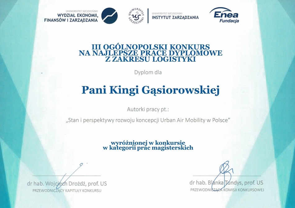 Mgr inż. Kinga Gąsiorowska otrzymała wyróżnienie za pracę pt. Stan i perspektywy rozwoju koncepcji Urban Air Mobility w Polsce. Promotorem pracy była dr Danuta Szpilko.