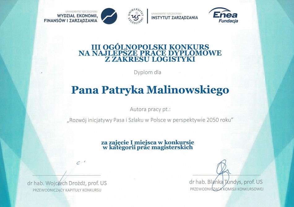 Mgr inż. Patryk Malinowski otrzymał I nagrodę za pracę pt. Rozwój Inicjatywy Pasa i Szlaku w Polsce w perspektywie 2050 roku. Promotorem pracy była dr Danuta Szpilko.