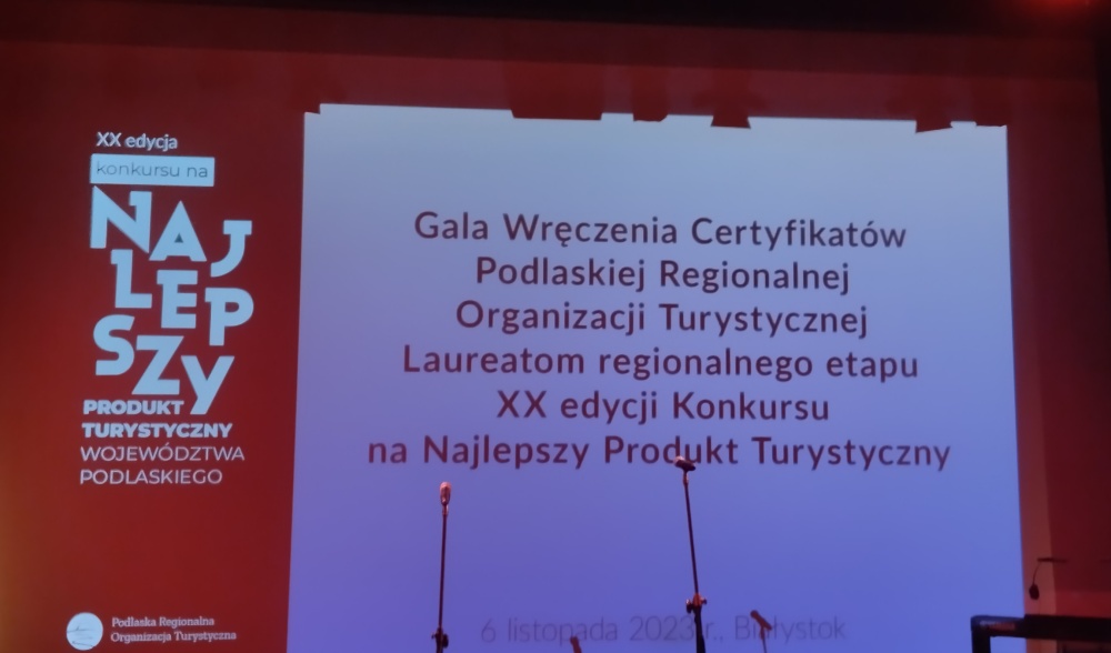 W dniu 6 listopada 2023 roku odbyła się uroczysta gala wręczenia certyfikatów Podlaskiej Regionalnej Organizacji Turystycznej laureatom regionalnego etapu XX edycji Konkursu na Najlepszy Produkt Turystyczny Polskiej Organizacji Turystycznej (POT). Konkurs ma na celu wyłonienie najbardziej atrakcyjnych, nowatorskich i przyjaznych dla turystów produktów turystycznych oraz ich popularyzację, a także wspieranie inicjatyw regionalnych i lokalnych, których efektem jest tworzenie produktów turystycznych. Certyfikaty POT stanowią rekomendację i gwarancję usług na najwyższym poziomie, podnoszą rangę produktu turystycznego i wzmacniają jego pozycję w ofertach dla klientów, dzięki czemu dany produkt staje się rozpoznawalny w całym kraju, a nawet za granicą.