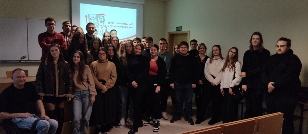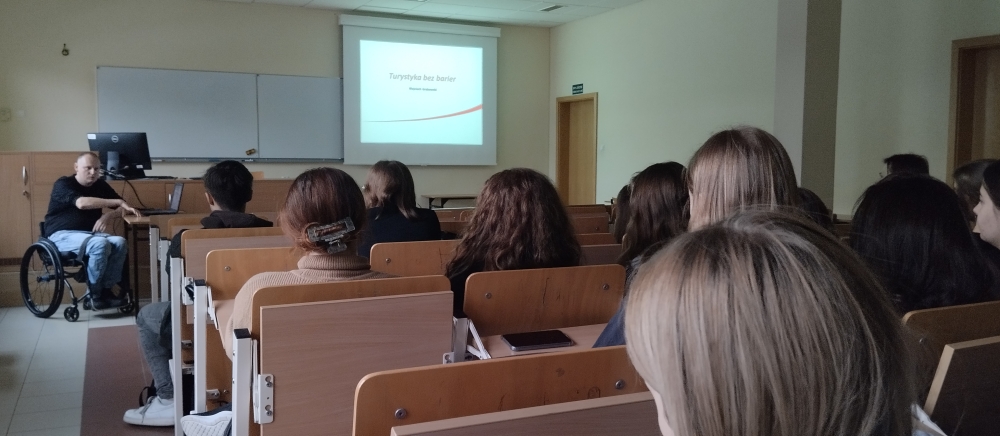 W dniu 6 listopada 2023 r. na naszym Wydziale gościliśmy Pana Wojciecha Grabowskiego, Prezesa Fundacji Inicjatyw Na Rzecz Osób Niepełnosprawnych IMPULS, Prezesa Stowarzyszenia Kibiców Niepełnosprawnych, kierownika programu Asystent Osoby Niepełnosprawnej, trenera pracy i instruktora aktywnej rehabilitacji. Jednocześnie aktywnego turystę, który odwiedził wiele miejsc w naszym regionie, kraju i na świecie.