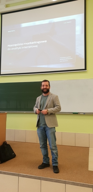 Dnia 27 listopada 2023 roku na naszym Wydziale mieliśmy przyjemność gościć doświadczonych praktyków biznesu reprezentujących renomowane agencje marketingowe z Białegostoku. Pierwszy wykład poprowadził Pan Rafał Kondratowicz, Head of Client Service NetArch Sp. z o.o., Sempai Agencja Marketingu Internetowego. Pan Rafał, mający ponad 10-letnie doświadczenie w marketingu internetowym, przekazał wiedzę na temat efektywnych sposobów wykorzystania narzędzi do analityki internetowej, w tym także zachowań e-klientów. Zaprezentowane studia przypadków dały studentom nowe spojrzenie na wykorzystanie instrumentów e-marketingu w praktyce.