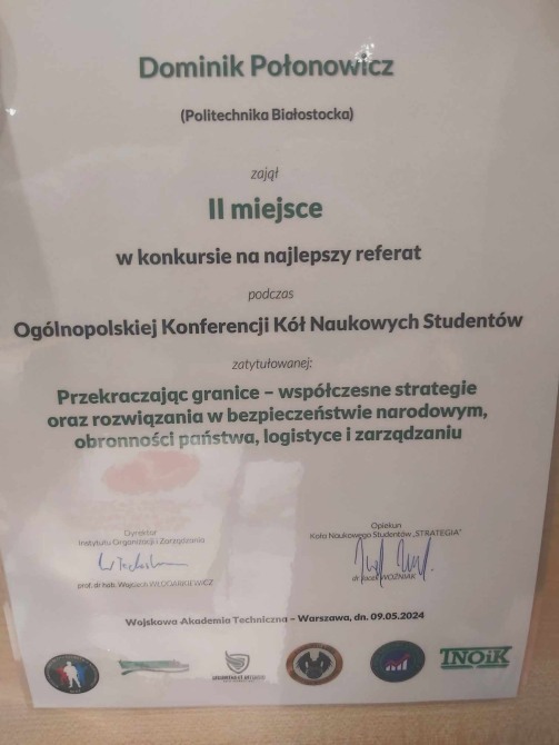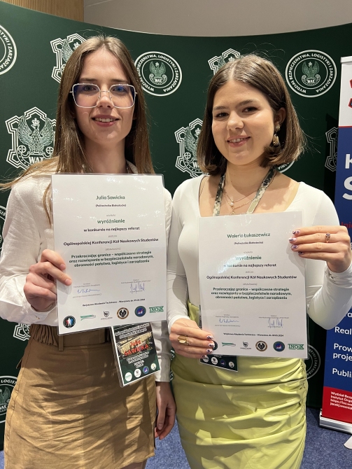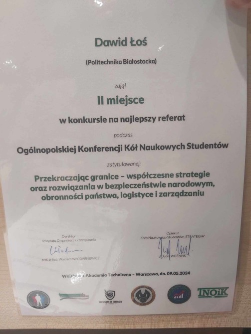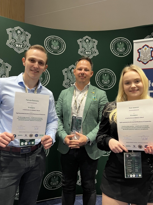 10-05-2024W dniu 9 maja 2024 r. zespoły studentów z Koła Naukowego Industry 4.0 oraz Koła Naukowego Zarządzania Kapitałem Ludzkim HR Team otrzymały nagrody podczas Ogólnopolskiej Konferencji Kół Naukowych Studentów zatytułowanej „Przekraczając granice – współczesne strategie oraz rozwiązania w bezpieczeństwie narodowym, obronności państwa, logistyce i zarządzaniu” na Wojskowej Akademii Technicznej w Warszawie