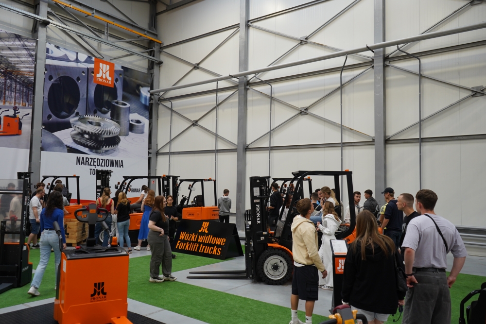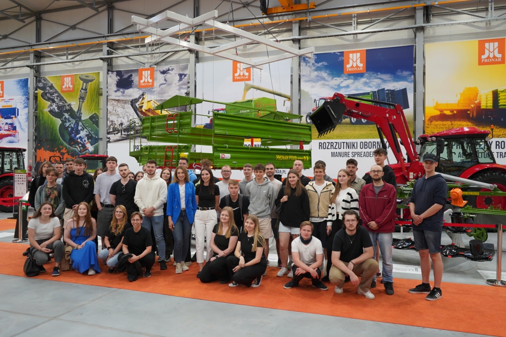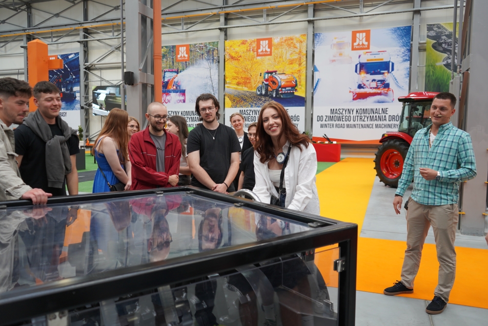 Studentów przywitał Pan Jacek Wakuluk, specjalista ds. Centrum Wystawowego, który oprowadził po obiekcie oraz zaprezentował historię i ofertę firmy. W ramach wizyty studyjnej zwiedzono nowoczesne Centrum Wystawowe Pronar, które stanowi unikalne w skali Europy miejsce prezentujące pełne portfolio firmy. Stała ekspozycja fabryczna zajmuje ponad 10 hektarów, na których można zobaczyć maszyny rolnicze, komunalne i recyklingowe, a także komponenty produkowane przez Pronar. Entuzjazm wśród studentów wzbudziło zwiedzanie części wystawowej i produkcyjnej meleksami.