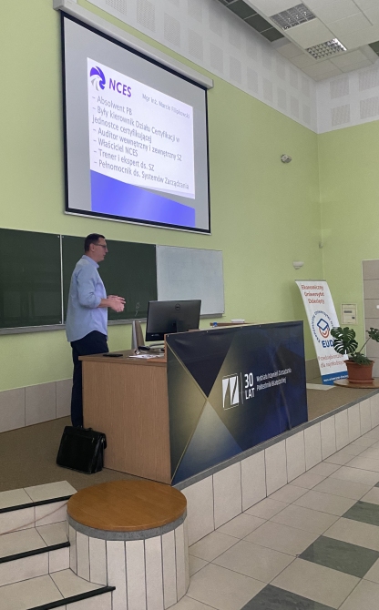Studenci mieli okazję zapoznać się ze specyfiką pracy konsultanta ds. rynku certyfikacji systemów zarządzania jakością, trendów i wyzwań w tym obszarze. Pan Marcin Filipkowski jest absolwentem Wydziału Inżynierii Zarządzania PB i często dzieli się swoją wiedzą oraz doświadczeniem z naszymi studentami zachęcając do rozwijania kariery jako przedsiębiorcy.