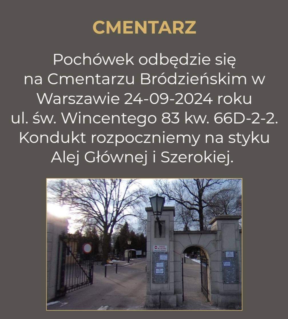 Uroczystości pogrzebowe odbędą się 24 września 2024 r. o godz. 10:00 w Domu Pogrzebowym Służew, sala pożegnań – „duża” (ul. Fosa 19A, Warszawa).