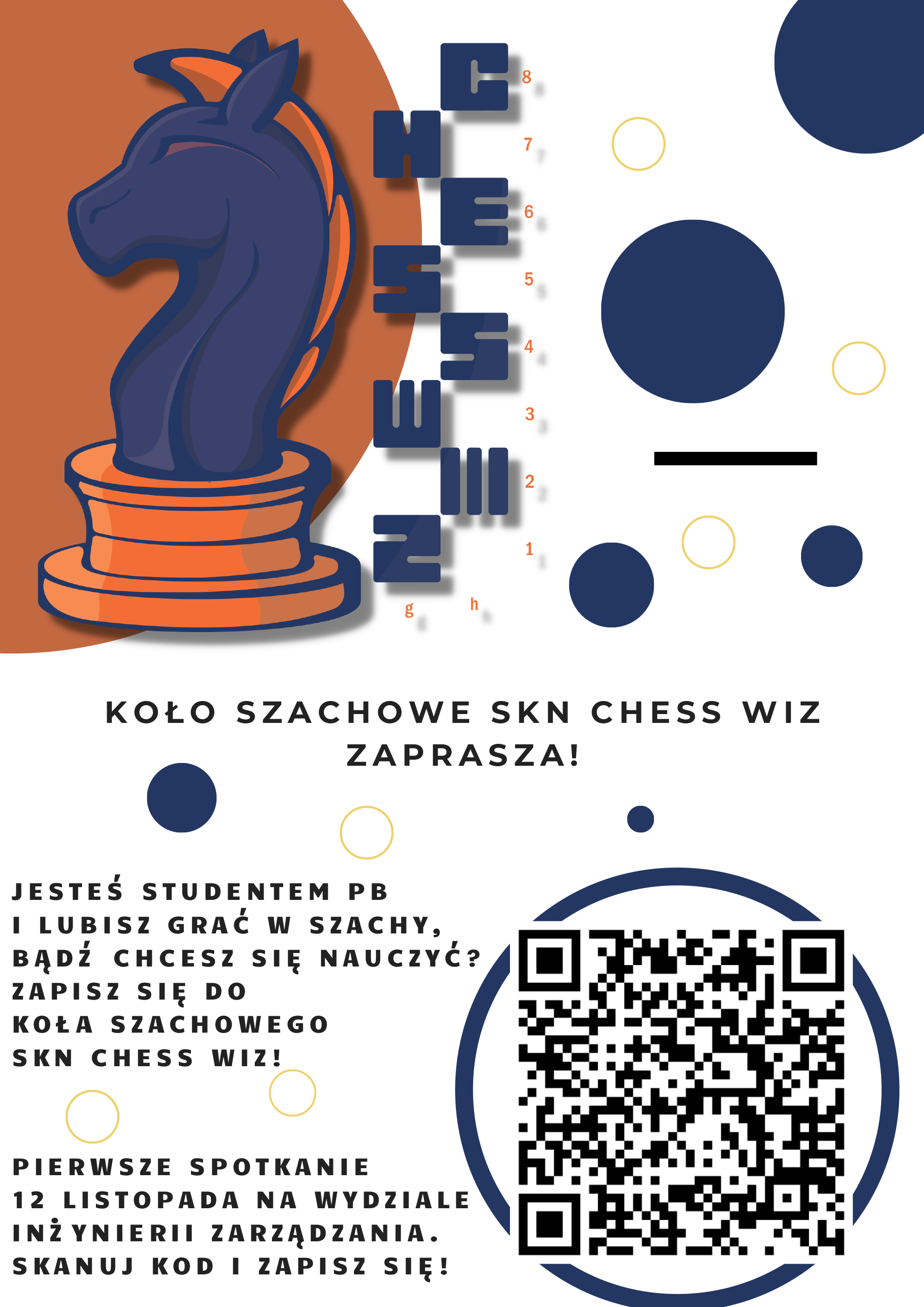 04-11-2024Jesteś studentem, który chce się nauczyć grać w szachy? Zapisz się do koła szachowego! Pierwsze spotkanie 12 listopada 2024 r. na Wydziale Inżynierii Zarządzania. Skanuj kod i zapisz się!