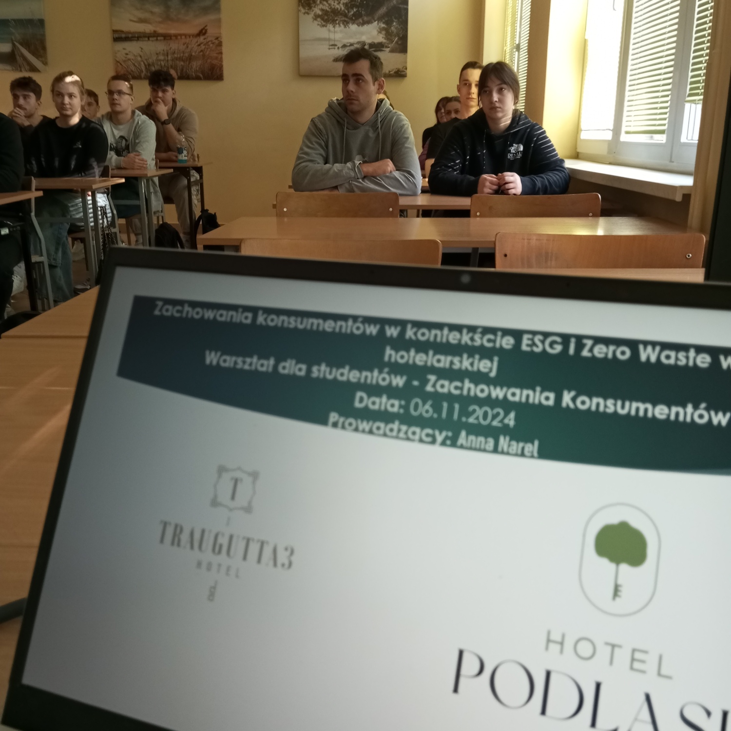 W ramach warsztatów studenci przeanalizowali przykłady działań ESG wdrażanych w obiektach hotelowych oraz ich wpływ na lojalność klientów i wizerunek przedsiębiorstwa. Poznali również konkretne techniki stosowane przez restauracje i hotele, które dążą do redukcji odpadów i minimalizacji negatywnego wpływu na środowisko. Spotkanie umożliwiło studentom bezpośrednią wymianę doświadczeń i zrozumienie, jak podejście proekologiczne może stać się przewagą konkurencyjną w branży.