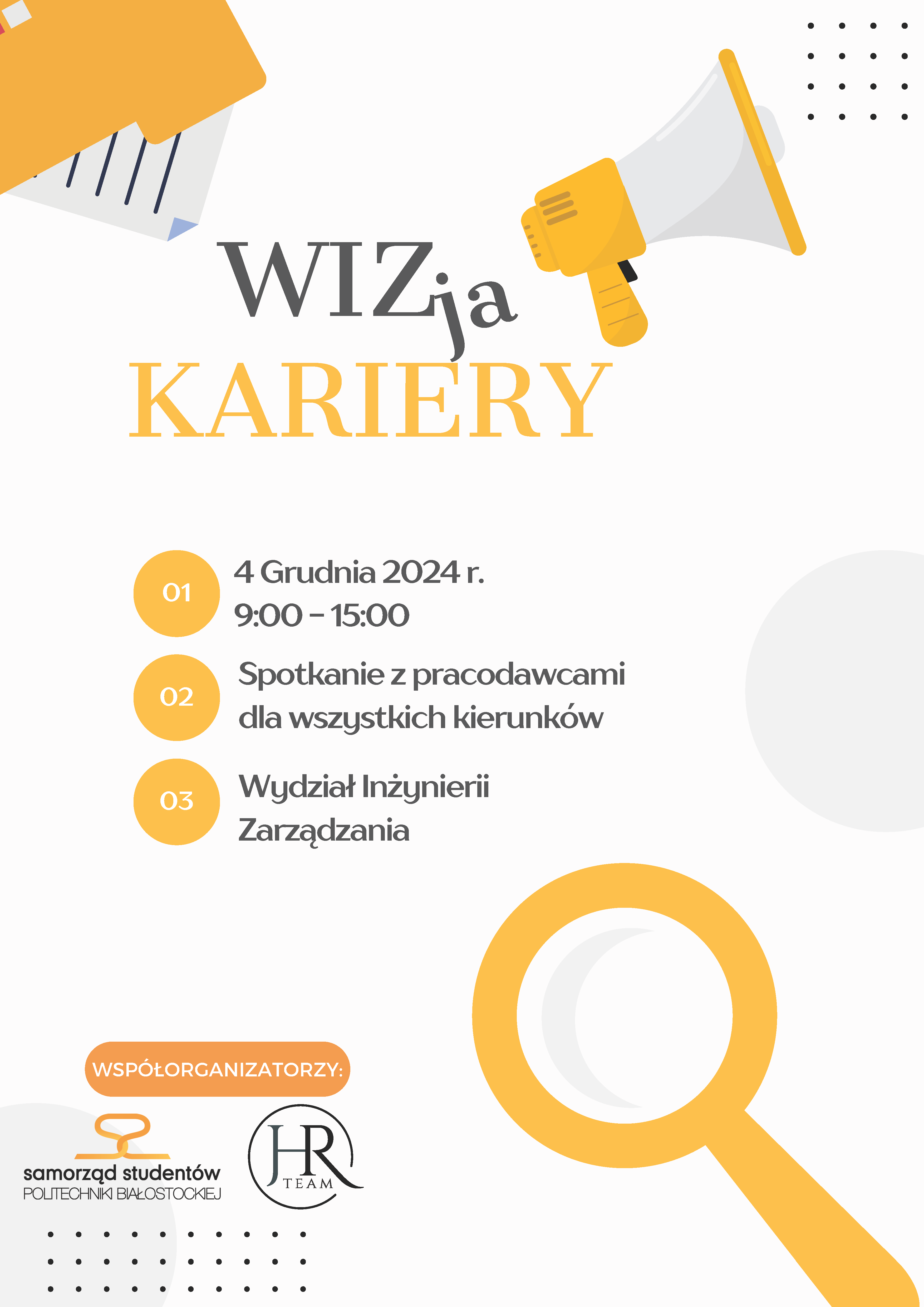 02-12-2024Samorząd Studentów WIZ oraz Koło Naukowe HR Team serdecznie zapraszają wszystkich studentów na wydarzenie – WIZja Kariery. To niepowtarzalna okazja, by poznać wiodące przedsiębiorstwa z województwa podlaskiego, zapoznać się z ofertami praktyk, staży i pracy, a także zajrzeć „od kuchni” do świata biznesu. Wydarzenie daje również możliwość nawiązania cennych kontaktów i budowania relacji zawodowych.