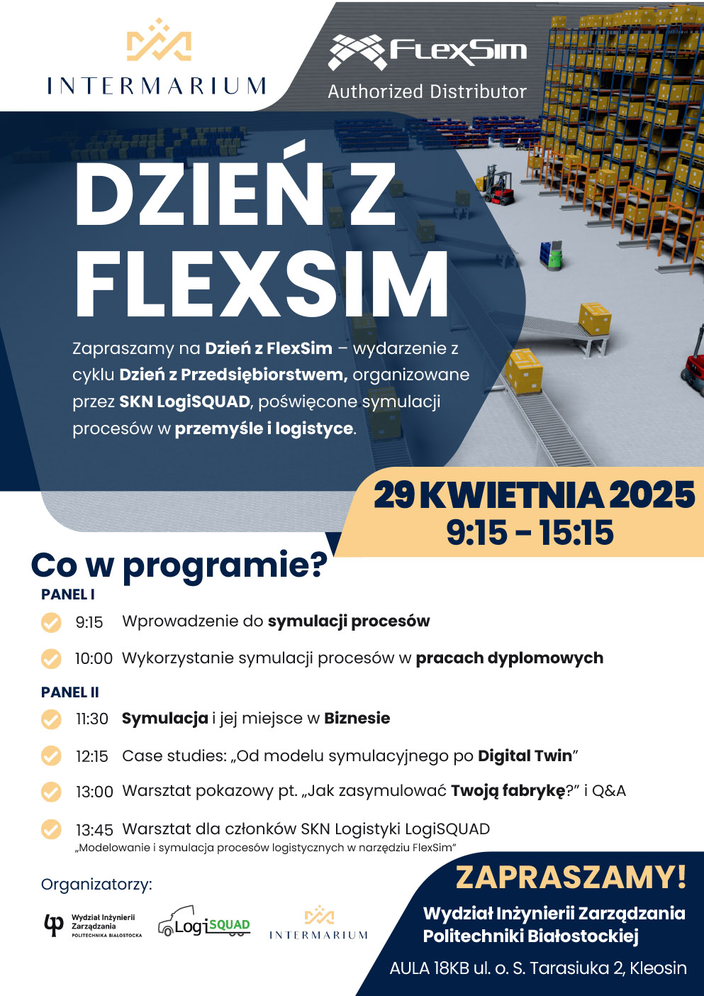 Serdecznie zapraszamy całą naszą społeczność akademicką oraz partnerów biznesowych Wydziału na Dzień z FlexSim, który odbędzie się 29 kwietnia 2025 roku (wtorek).