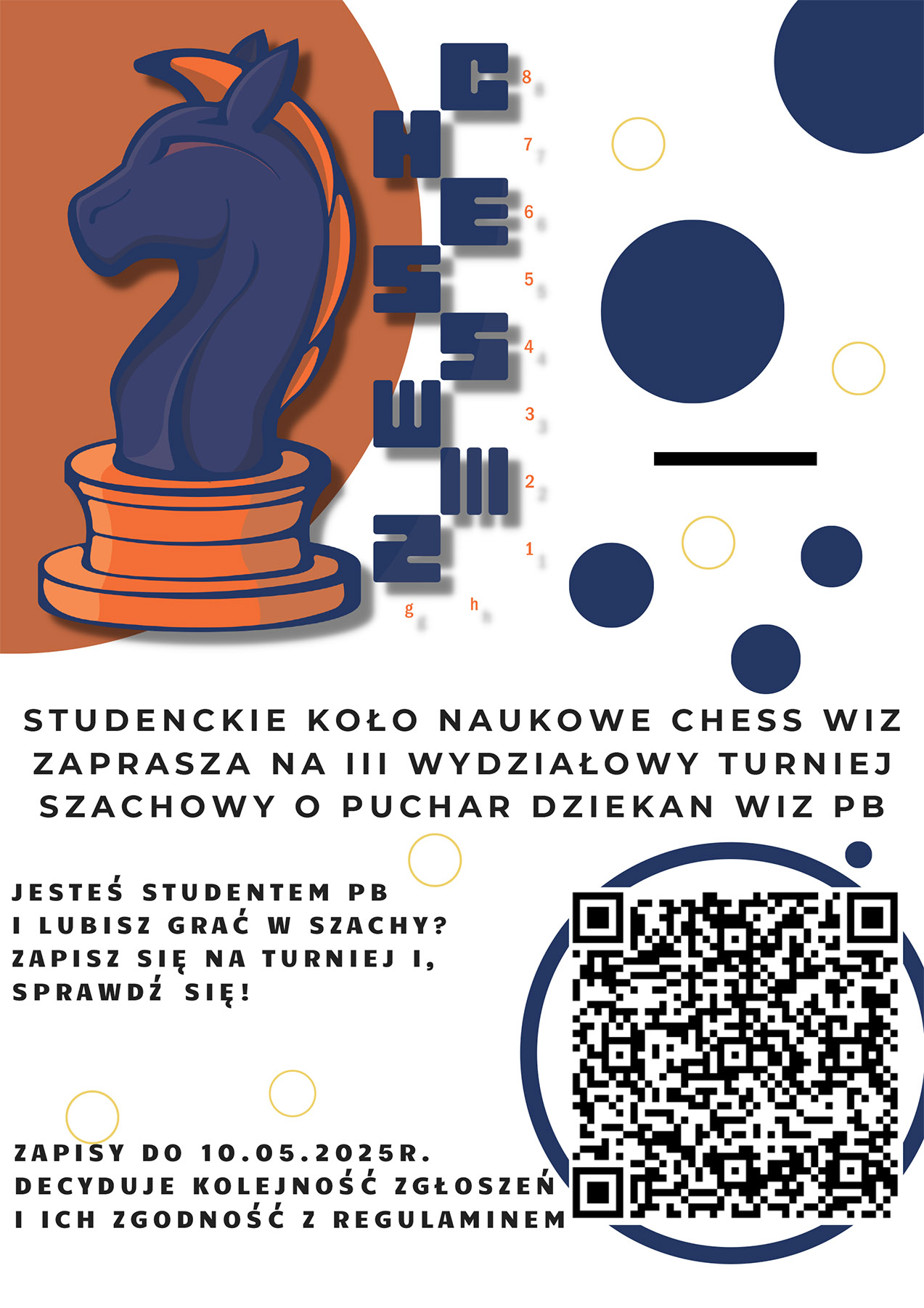 Zapisz się na III Wydziałowy Turniej Szachowy o Puchar Dziekan WIZ PB, organizowany przez Studencie Koło Naukowe Chess WIZ, który odbędzie się w dniu 14 maja 2025 r.