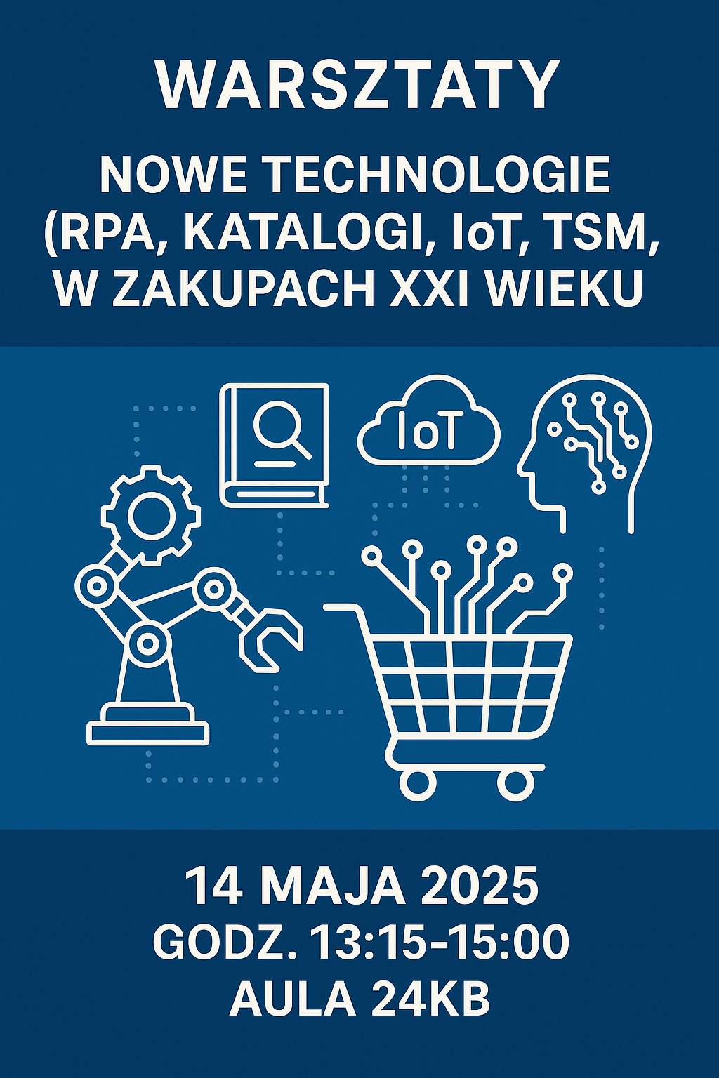 12-05-2025Serdecznie zapraszamy całą naszą społeczność akademicką na warsztaty pn.: Nowe technologie (RPA, Katalogi, IoT, TSM czy AI) w zakupach XXI wieku, które odbędą się 14 maja 2025 roku, w godzinach od 13:15 do 15:00, w auli 24KB. Warsztaty poprowadzi Pan Andrzej Zawistowski.