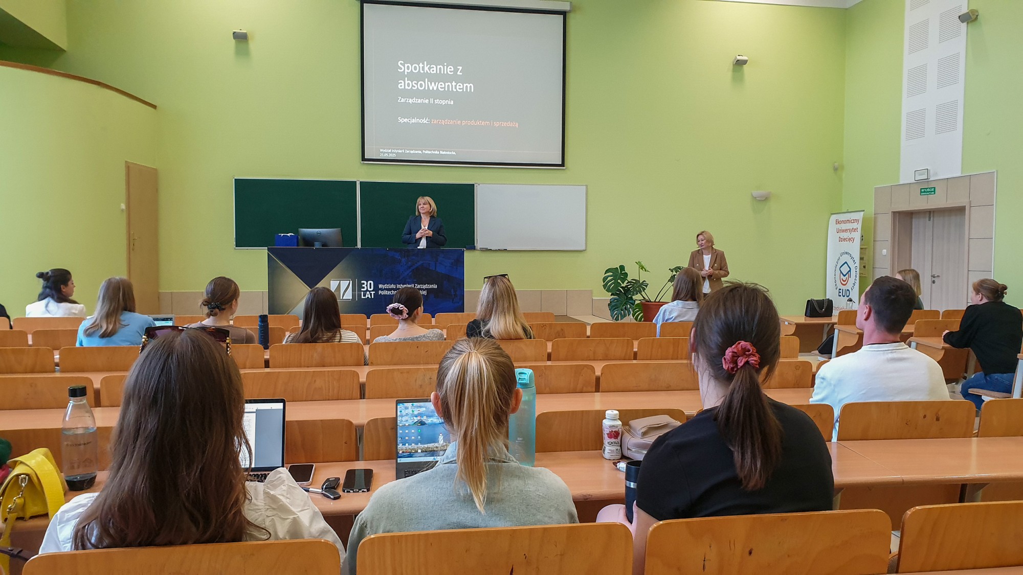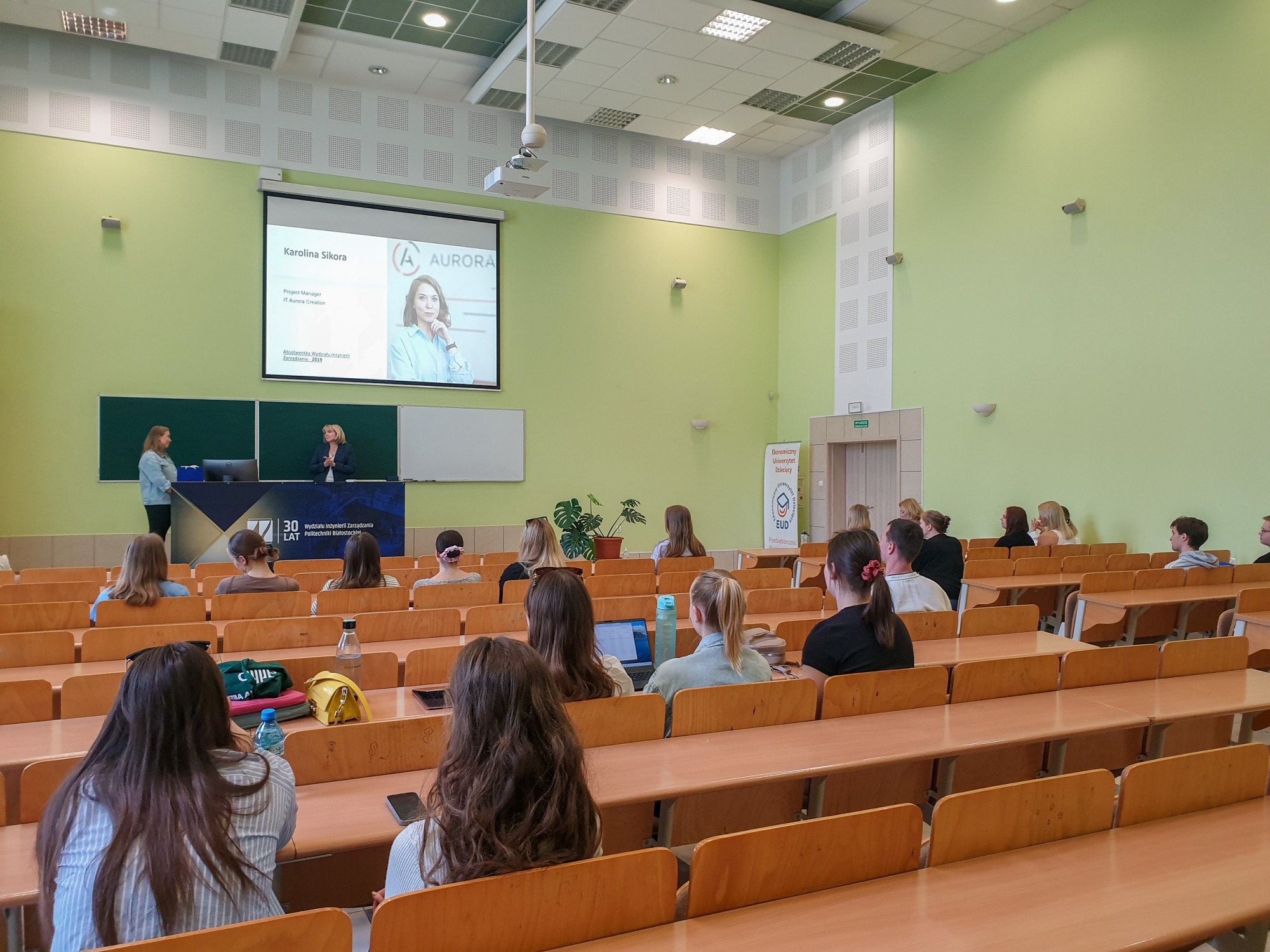 Studenci trzeciego roku studiów licencjackich dwóch kierunków: zarządzanie oraz zarządzanie i inżynieria usług, usłyszeli trzy ciekawe historie rozwoju kariery zawodowej w marketingu i e-commerce. Dostali także pakiet cennych rad dotyczących studiowania, budowania ścieżki rozwoju zawodowego oraz zarządzania zespołami.