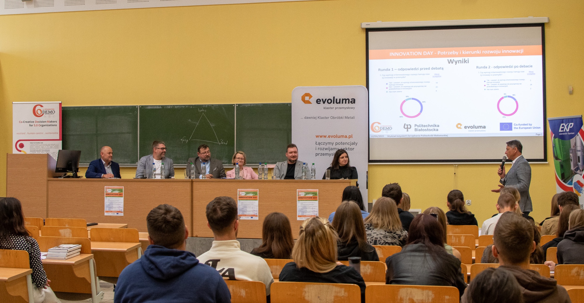 12 czerwca 2025 r. na Wydziale Inżynierii Zarządzania Politechniki Białostockiej odbyło się wyjątkowe wydarzenie – Innovation Day, organizowane w ramach projektu Co-Creative Decision-Makers For 5.0 Organizations” (CoDEMO 5.0) przy współpracy Klastra Przemysłowego EVOLUMA.
