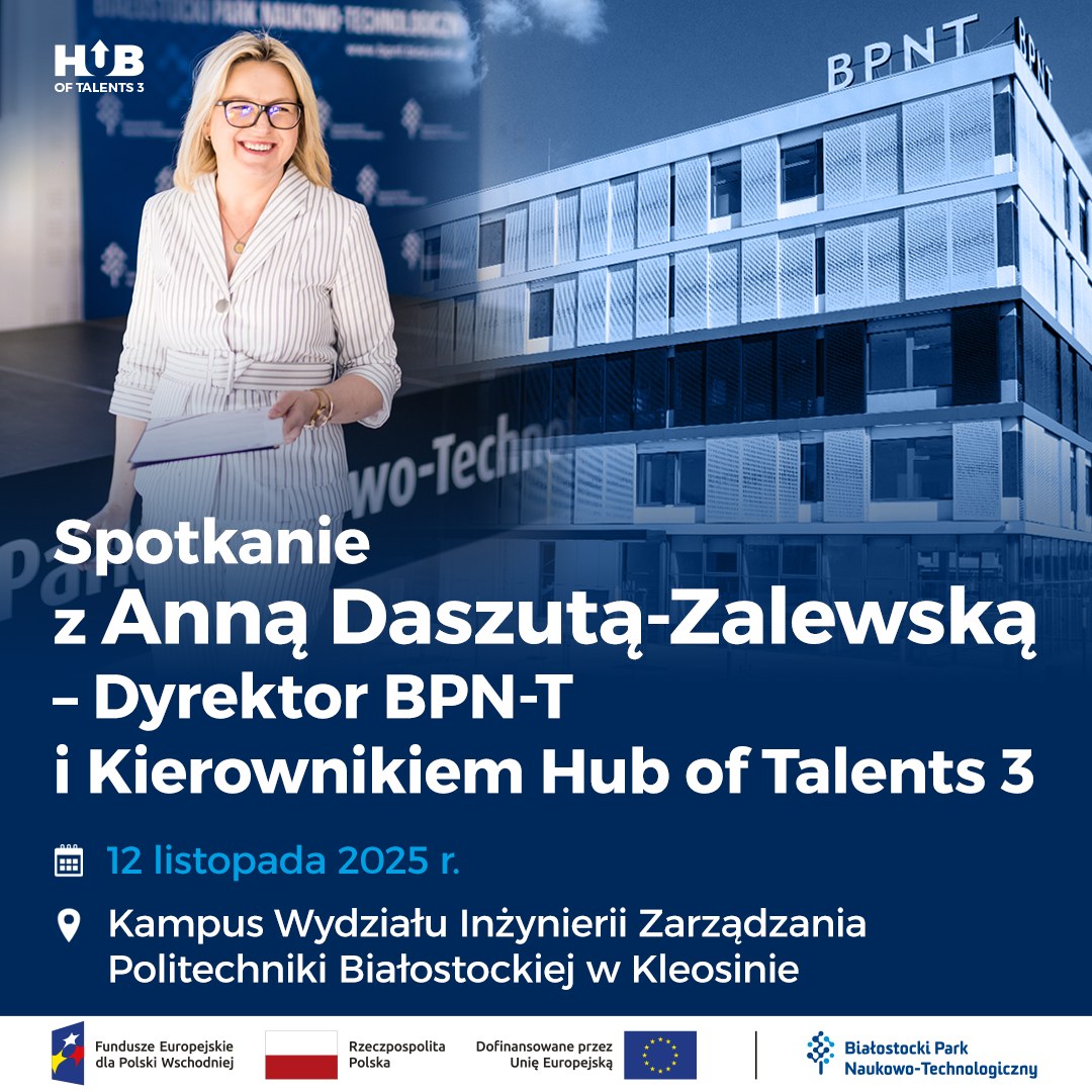 05-11-2025Wydział Inżynierii Zarządzania Politechniki Białostockiej ma zaszczyt zaprosić studentów na inspirujące spotkanie z Panią Anną Daszutą-Zalewską, Dyrektor Białostockiego Parku Naukowo-Technologicznego (BPNT).