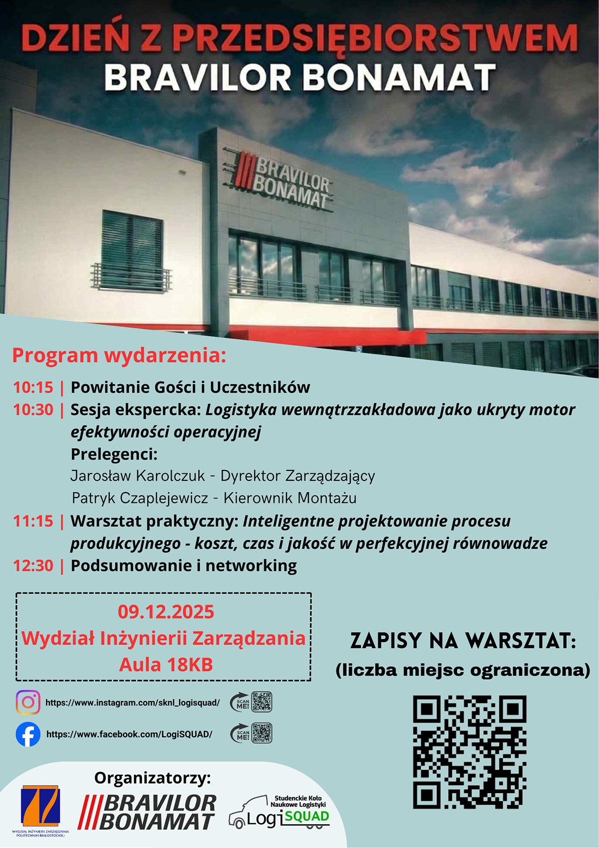 05-12-2025Serdecznie zapraszamy całą społeczność akademicką naszego Wydziału na Dzień z Bravilor Bonamat, w trakcie którego uczestnicy będą mogli przyjrzeć się wybranym procesom logistyki produkcji w praktycznym ujęciu.