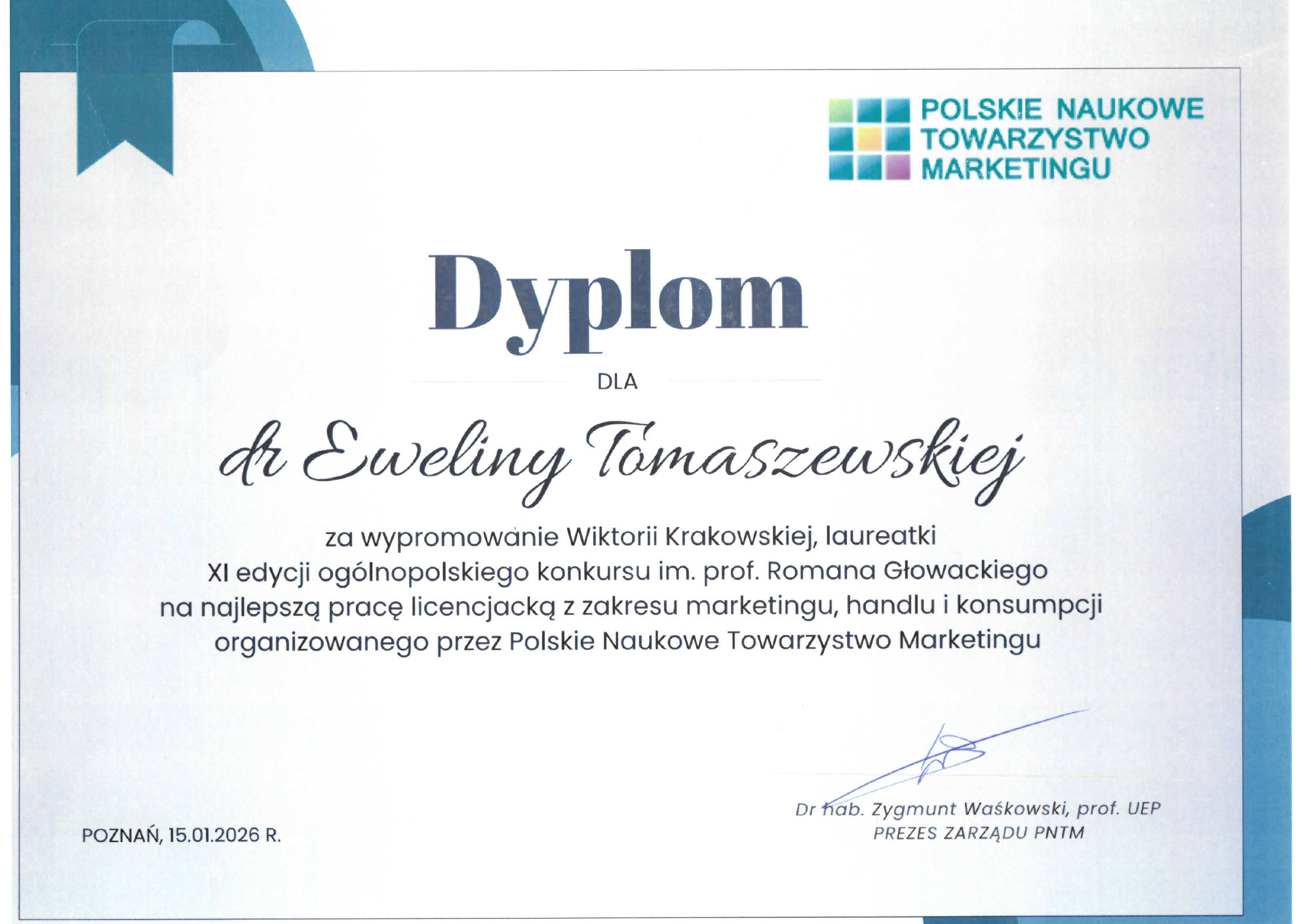 W tegorocznej edycji konkursu lic. Wiktoria Krakowska została nagrodzona II miejscem za pracę licencjacką pt. „Marka osobista i jej rola w budowaniu wizerunku kobiecych biznesów w mediach społecznościowych – analiza studiów przypadku”. Promotorem pracy była dr Ewelina Tomaszewska z Katedry Marketingu i Turystyki.