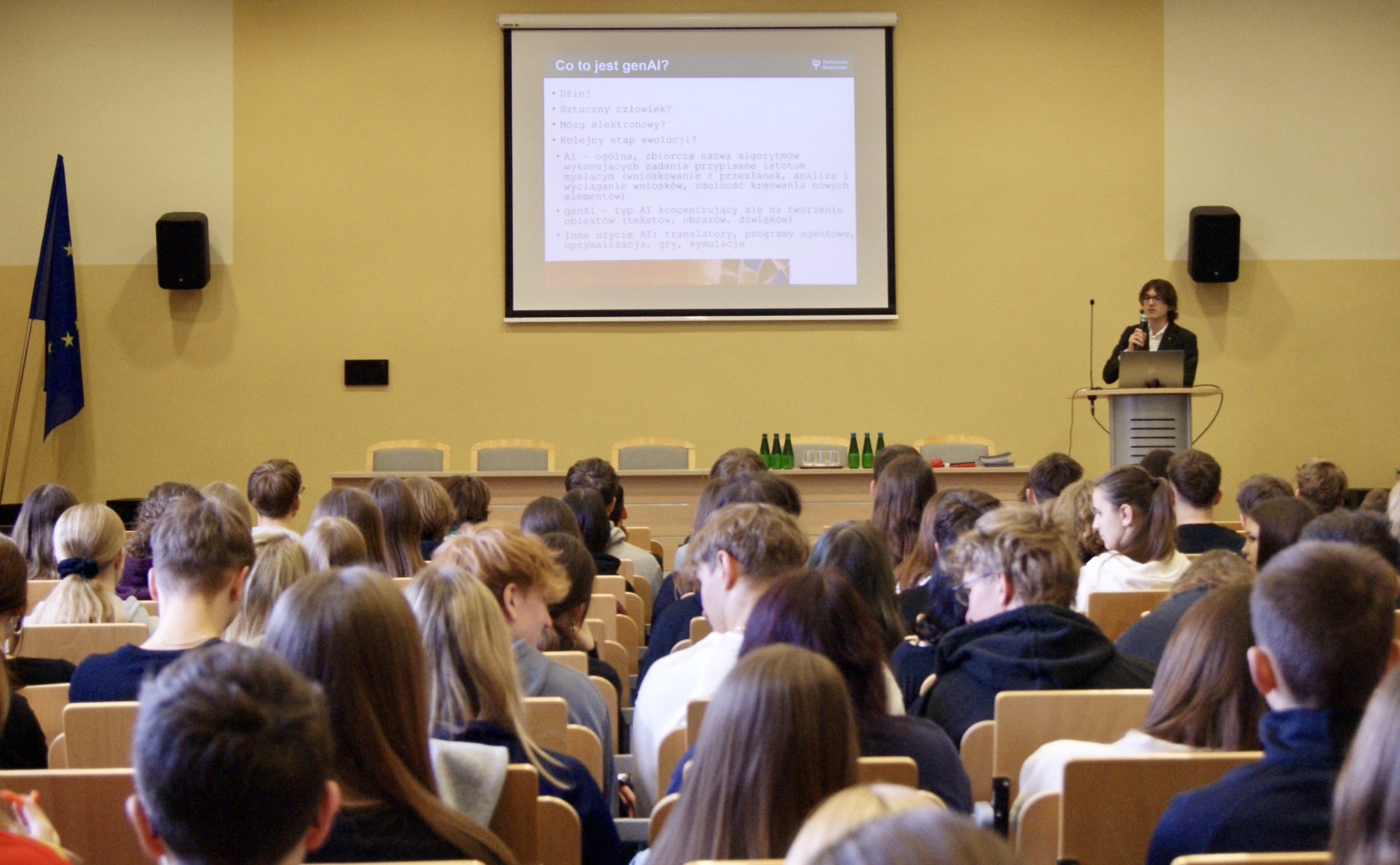 Nasz pracownik w pierwszej części wyjaśnił sposób funkcjonowania popularnych narzędzi, takich jak ChatGPT, a potem zaprosił do udziału w krótkim badaniu dotyczącym odróżniania tekstów wygenerowanych sztucznie od napisanych przez człowieka. Na koniec zaś podzielił się wiedzą na temat studiowania oraz możliwości oferowanych przez Politechnikę Białostocką.