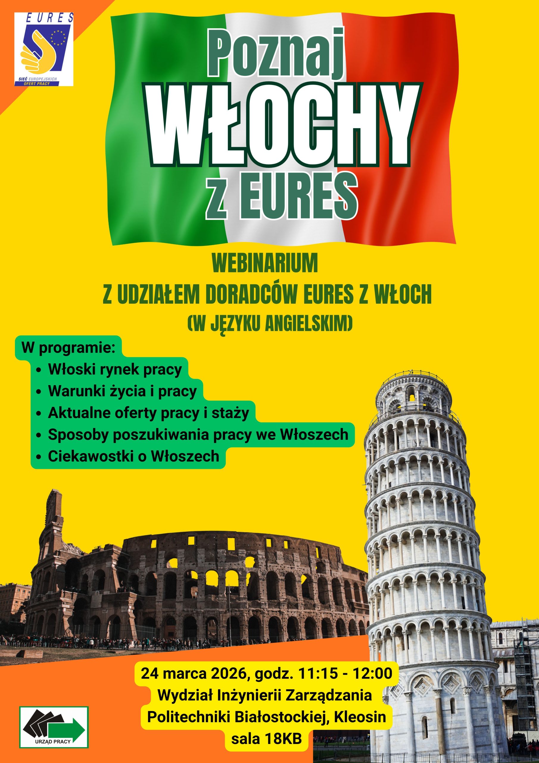 Wspólnie z doradcami EURES z Włoch i Polski zapraszamy na Wydział Inżynierii Zarządzania Politechniki Białostockiej, 24 marca 2026 r., godz. 11:15-12:00, aula 18 KB