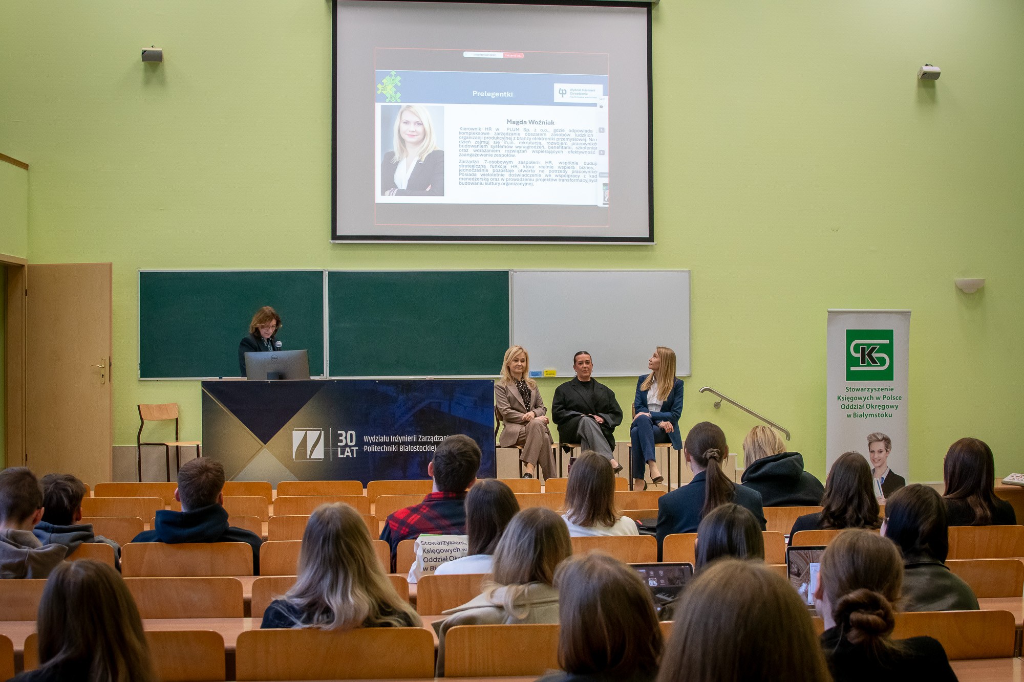 W pierwszej sesji panelowej – „Praktycy o codziennych wyzwaniach w finansach i zarządzaniu” wzięły udział: pani Beata Kropiewnicka Prezes Stowarzyszenia Księgowych w Polsce Oddział Okręgowy w Białymstoku i zastępca dyrektora ds. finansowych/główny księgowy dużego podmiotu sektora publicznego, pani Magdalena Maślińska – Prokopiak specjalistka w obszarze kadr i płac z LeasingTeam Sp. z o.o. oraz pani Magda Woźniak kierownik HR w PLUM Sp. z o.o. Podczas sesji panelowej zaproszone ekspertki w niezwykle merytoryczny sposób przybliżyły słuchaczom specyfikę współczesnego zarządzania. Dyskusja pokazała, że w nowoczesnych finansach wiedza techniczna musi być nierozerwalnie związana z empatią i odwagą w podejmowaniu decyzji. Prelegentki zgodnie podkreśliły, że praca w obszarze finansów, HR czy audytu ewoluuje w stronę cyfrowego partnerstwa. Sprawne poruszanie się w świecie nowych technologii nie jest już dodatkiem, lecz elementem niezbędnym w codziennym warsztacie pracy. Jednakże mimo cyfrowej rewolucji i automatyzacji, ostatecznym punktem odniesienia pozostaje etyka zawodowa. Uczestniczki panelu zwróciły także uwagę na konieczność ciągłego kształcenia oraz umiejętność adaptacji do zmian, co w dobie dynamicznych przepisów i nowych wyzwań rynkowych decyduje o sukcesie zawodowym. Spotkanie, dzięki praktycznemu podejściu prelegentek, cieszyło się bardzo dużym zainteresowaniem słuchaczy, stanowiąc inspirujący pomost między teorią akademicką a realiami biznesu.