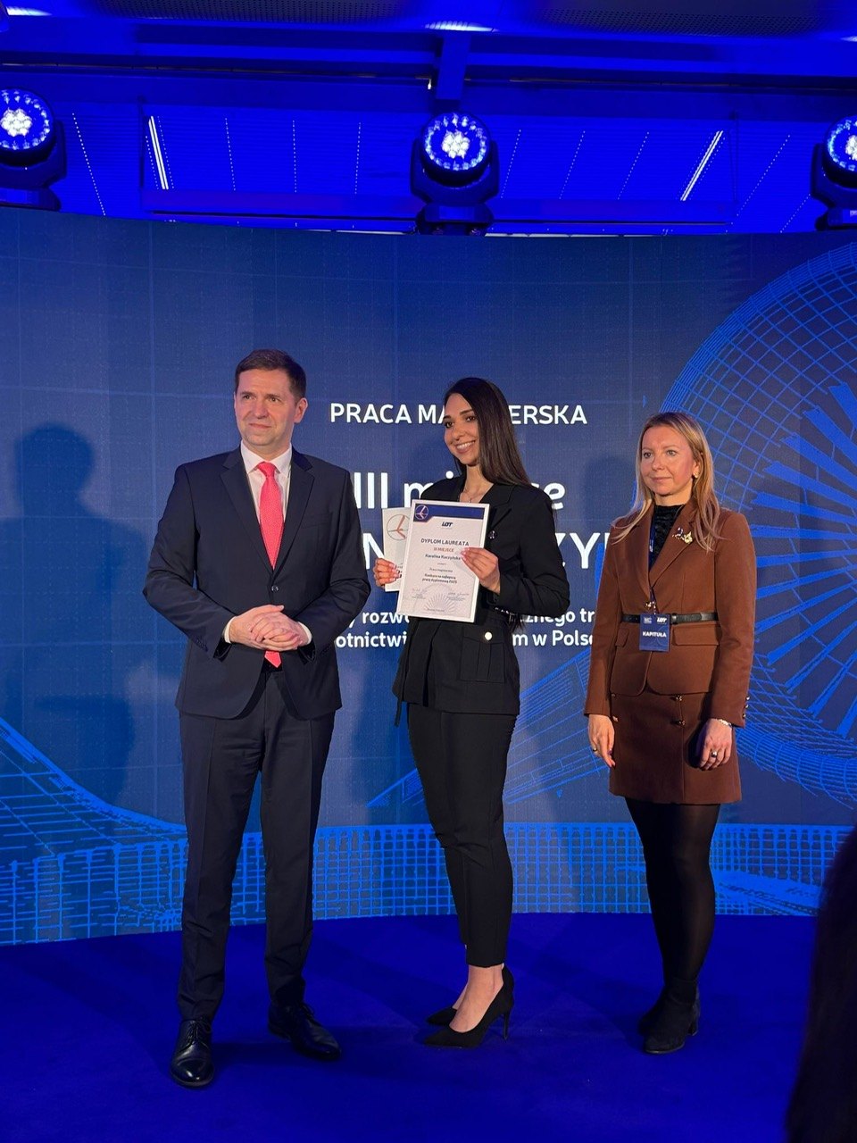 Z wydziału Inżynierii Zarządzania laureatką w kategorii prac magisterskich została mgr inż. Karolina Kuczyńska – Absolwentka kierunku Logistyka, zajmując III miejsce. Nasza Laureatka przygotowała i obroniła w 2024 roku pracę dyplomową pod tytułem Perspektywy rozwoju autonomicznego transportu w lotnictwie pasażerskim w Polsce. Promotorem pracy była prof. dr hab. inż. Joanna Ejdys.