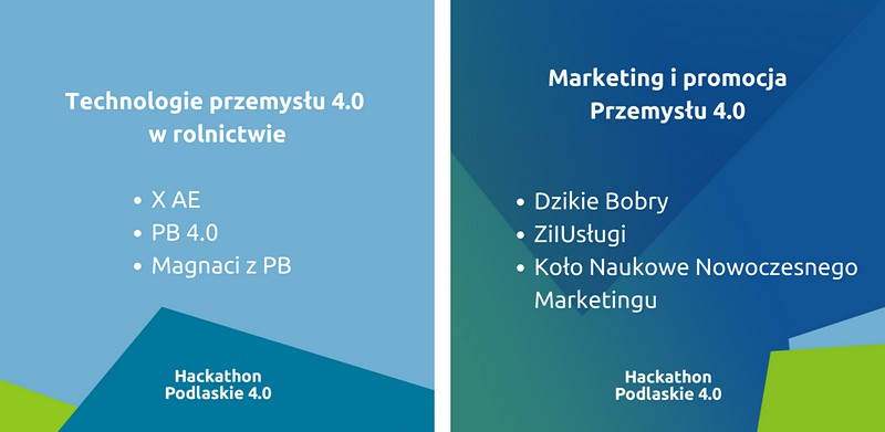 W kategorii tematycznej Technologie przemysłu 4.0 w rolnictwie drugie miejsce (i nagrodę w wysokości 4000 zł) zdobył zespół PB 4.0 w składzie Adrian Białobrodzki, Paulina Olszyńska , Gabriela Smiszczułka, Martyna Wilczewska (członkowie Koła Naukowego Industry 4.0, opiekun: dr inż. Łukasz Dragun) i Paulina Niewińska (Formacja SKN Organizacji i Zarządzania, opiekun: dr hab. inż. Wiesław Urban, prof. PB). Zespół zaprezentował koncepcję Agri 4.0 – giełdę wynajmu maszyn rolniczych.