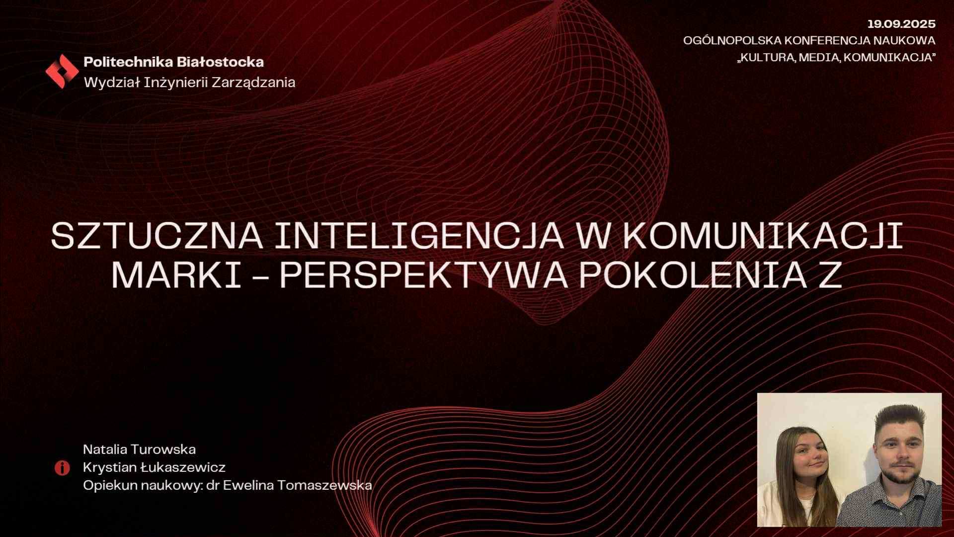 W dniu 19 września 2025 roku przewodnicząca Koła Natalia Turowska oraz wiceprzewodniczący Krystian Łukaszewicz wraz z opiekunką koła dr Eweliną Tomaszewską wygłosili referat pt. “Sztuczna inteligencja w komunikacji marki – perspektywa pokolenia Z” podczas Ogólnopolskiej Konferencji Naukowej “Kultura, Media, Komunikacja”.